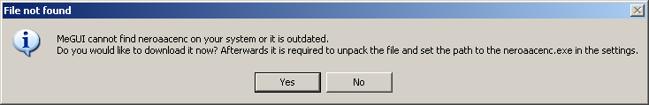 When MeGUI has finished updating, restart MeGUI as prompted. The location where you put neroAacEnc.exe probably won't match the location that MeGUI expects to find it, so MeGUI may prompt for the file again if it updates during startup. If that happens, just abort the update for now and we'll fix it in a moment.