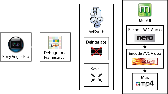 Aspects of this workflow were refined while participating in this discussion on the excellent Sony Vegas Pro forum. Many thanks to Musicvid (Mark), amendegw (Jerry), John Meyer, farss (Bob) and Laurence for their help and insight. Thanks to the other folk on the Sony Vegas Pro and doom9.org forums who have contributed hugely to my understanding of video. Thanks to Jerry, Kimberly and "Stringer" (Gregory) for permission to use test footage, and to dxdy (Fred) for hosting test renders on his Vimeo account. And thanks of course to the geniuses who write these amazing free tools that make this possible.