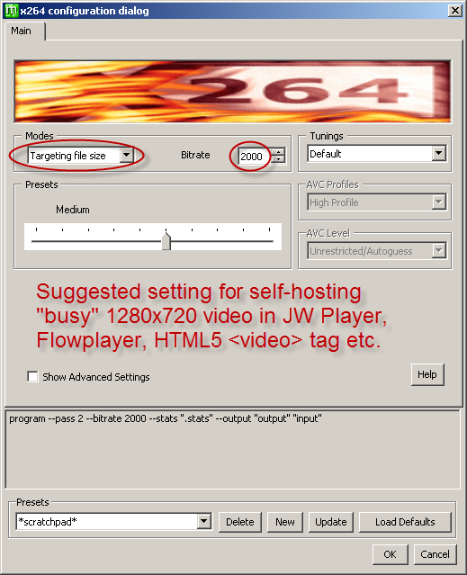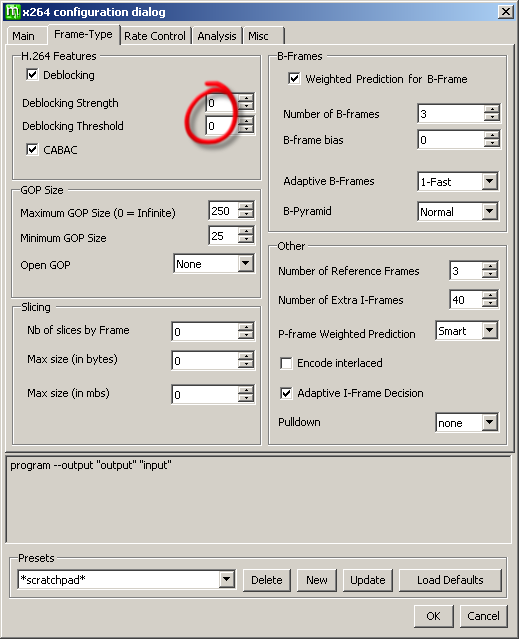 If you do this, keep them both within the range -3 to 2 and keep them both the same or within 1 value of each other. Negative numbers reduce the amount of deblocking and preserve more detail. This will be sharper but will increase the chance of blockiness. Positive values decrease the chance of blockiness but soften/blur the video. You can get away with less deblocking at high bitrates, so for upload to YouTube, Vimeo etc., you could try setting Deblocking Strength to -2 and Deblocking Threshold to -1. For lower bitrates for self-hosting I usually leave them both at 0. More info about x264 deblocking on the doom9 forum. Also, this guide encourages adjusting deblocking settings, whereas this guide generally discourages it. As visual comparisons are very hard to make, I suggest trying it with some extreme settings at first so you know what you are looking for in the rendered video.