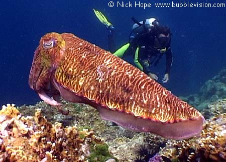 Pharaoh cuttlefish (Sepia pharaonis) often accompany my safety stop at Burma's Fan Forest Pinnacle.