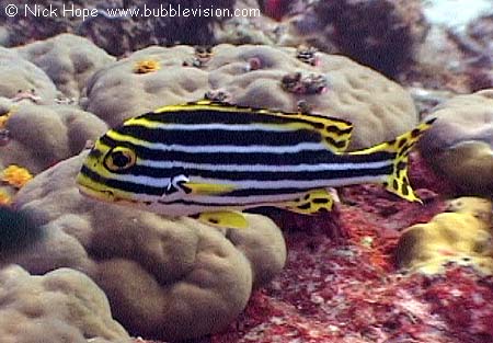 The fine-looking oriental sweetlips (Plectorhinchus vittatus) is quite common at the Burma Banks.
