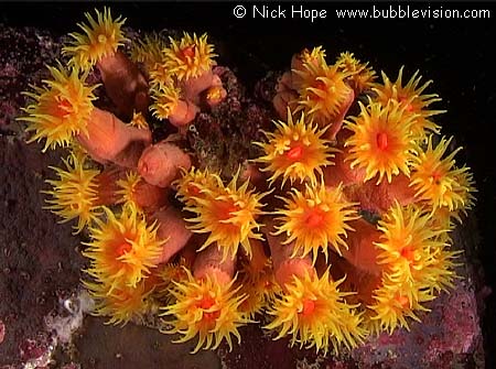 Orange cup coral (Tubastrea coccinea) is common throughout the Andaman Sea. This pretty example is from Cavern Island.