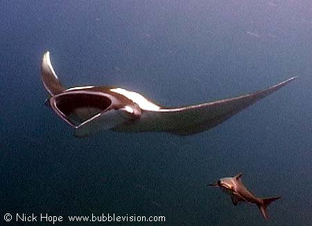Another manta ray (Manta birostris) at Koh Bon. Cobias (Rachycentron canadum, bottom right) almost always accompany large vertebrates such as manta rays.
