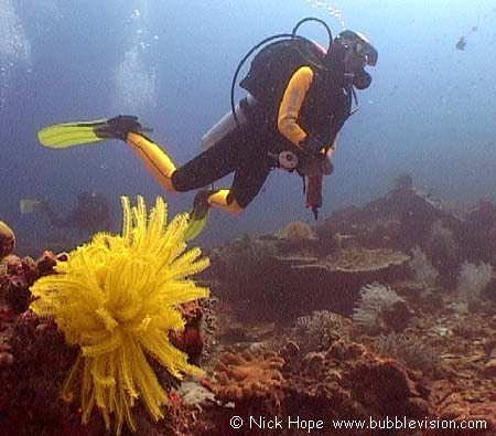 A yellow crinoid (feather star) filters plankton from the water at the coral garden at Koh Tachai.