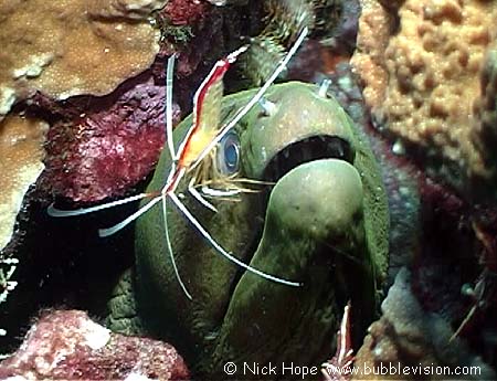 Skunk cleaner shrimps (Lysmata amboinensis) and giant morays (Gymnothorax javanicus) love to hang out together. The moray stays clean and the shrimp gets fed.