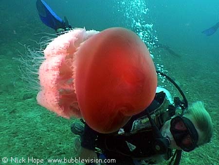 When the water temperature suits them, rhizostome jellyfish (Crambione mastigophora) are sometimes found in great numbers at many of the dive sites in the Mergui archipelago.