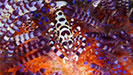 Fire Urchin HD VideoAt Sunview in Anilao, various crustaceans form commensal relationships with the fire urchin to protect themselves from predators. Coleman shrimps, Periclimenes colemani, usual live in pairs on top of the fire urchin. The female is larger than the male. Zebra crabs, Zebrida adamsii, and urchin shrimps, Allopontonia brockii, are often found near the bottom of fire urchin. |