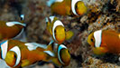 Saddleback Clownfish HD VideoA school of 9 young saddleback clownfish, Amphiprion polymnus, at Balanoy (Secret Garden) in Anilao in the Philippines swim against the current next to an anemone that's really far too small for them. |