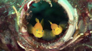 Hairball VideoThis classic muck dive is also on the Sulawesi side of the Lembeh Strait and is so named because of the weed lying on the black volcanic sand. The video opens with a hairy frogfish (striated anglerfish) squaring up to the camera and closes with an Ambon scorpionfish swallowing a small bypasser. In between we meet nudibranchs including the distinctive Melibe viridis, an orange devil scorpionfish, a moray eel hosting a cleaner shrimp, filefish, a peacock mantis shrimp, a lionfish and an urchin crab taking cover under a blue-spotted urchin. |